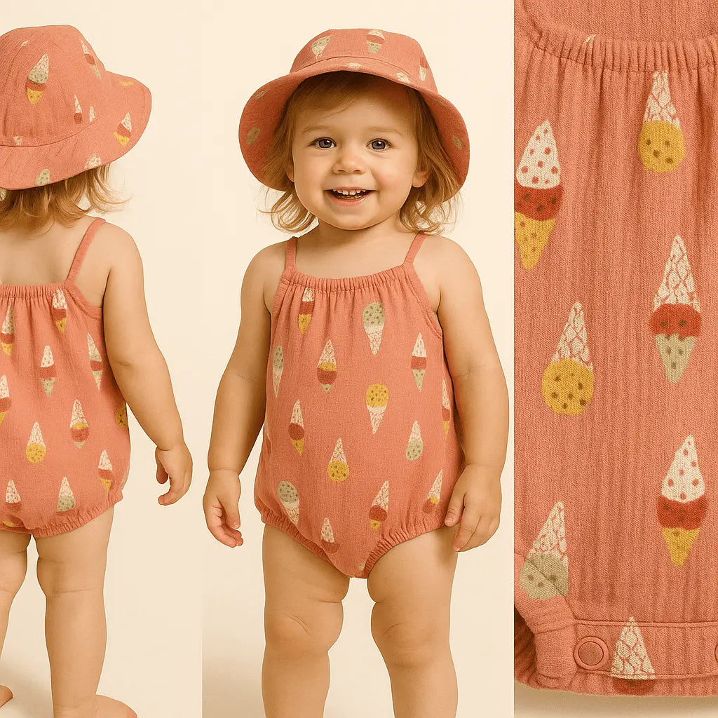 Offrez à votre petite princesse un look estival irrésistible avec cette barboteuse à bretelles pour bébé fille, accompagnée de son chapeau assorti. De couleur corail vive, cette tenue est rehaussée d’un motif glace gourmand qui sent bon l’été !