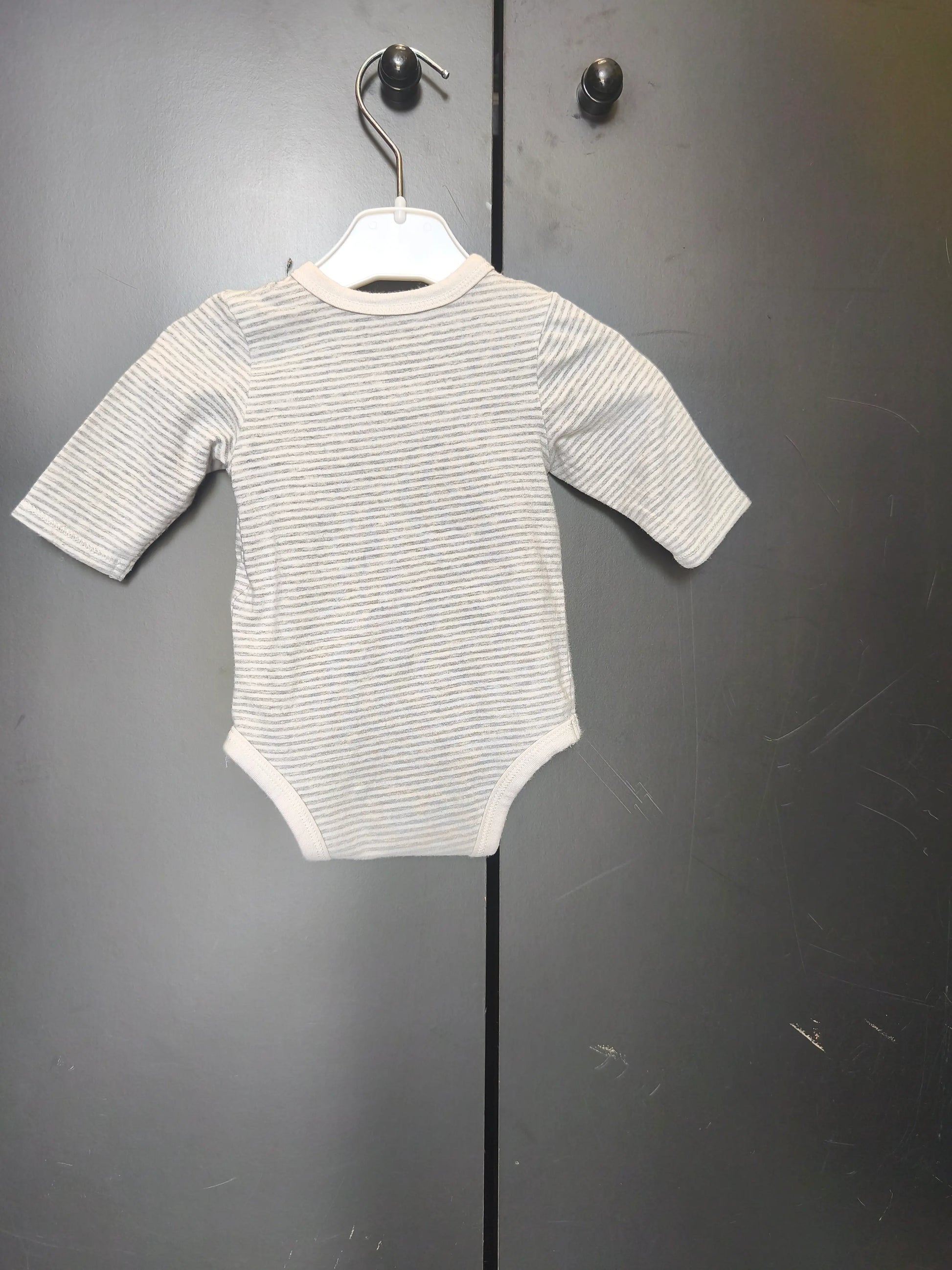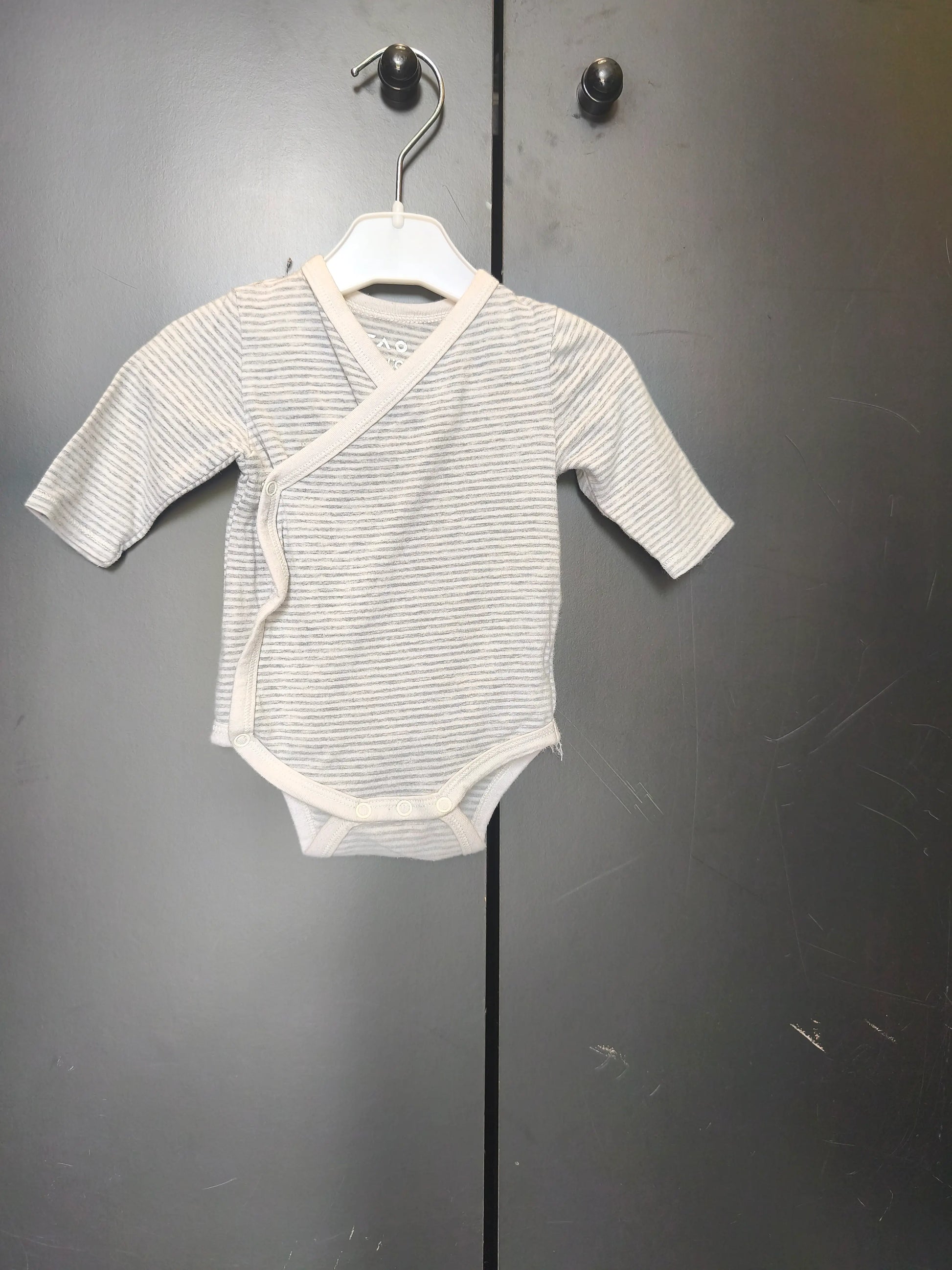 Body Tape à l’Œil 1 mois - Gris rayé blanc, manches longues, ouverture croisée ref 31