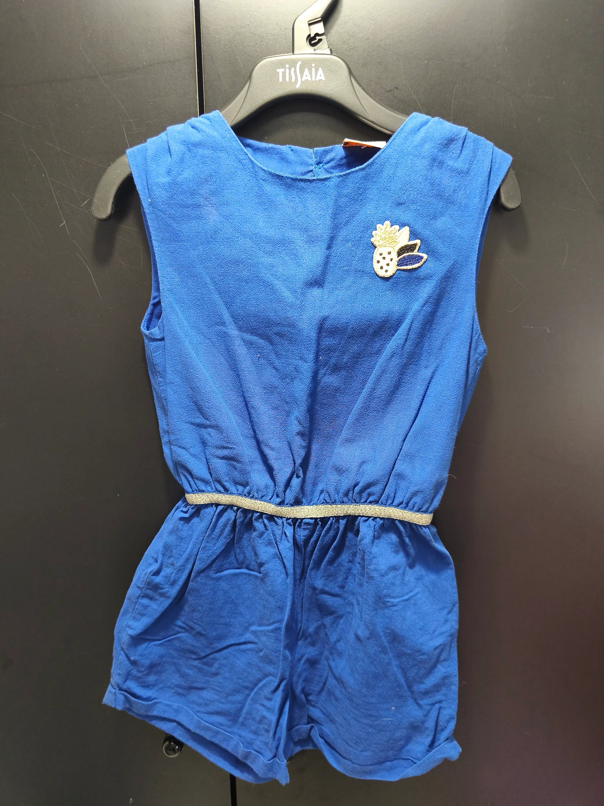 Combi-Short Tape à l’Œil Bleu Électrique – Manches Courtes, Broderie Ananas, Ceinture Élastique Dorée – 4 Ans