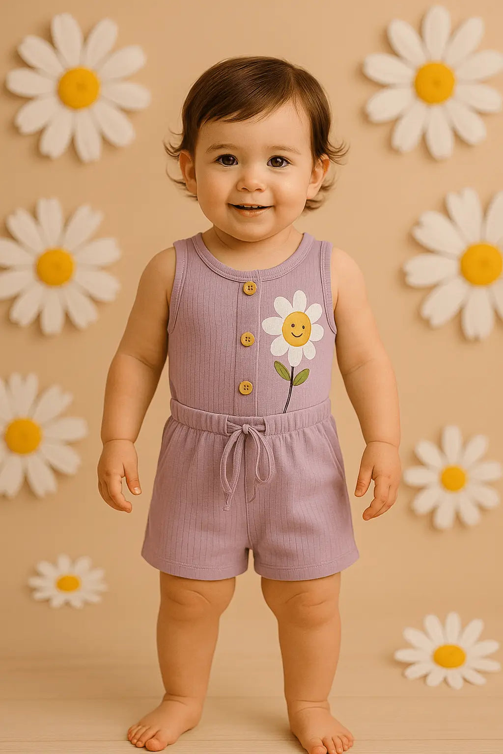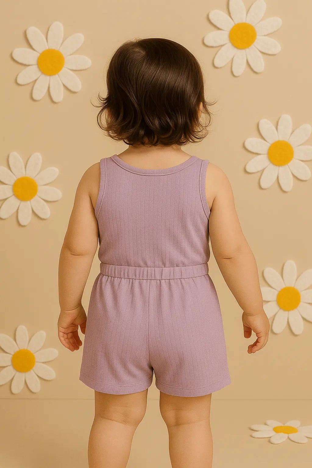 Faites fondre les cœurs avec cette adorable combinaison short lilas pour bébé fille ! Fabriquée en 100% coton, elle est douce, respirante et parfaite pour les journées chaudes.