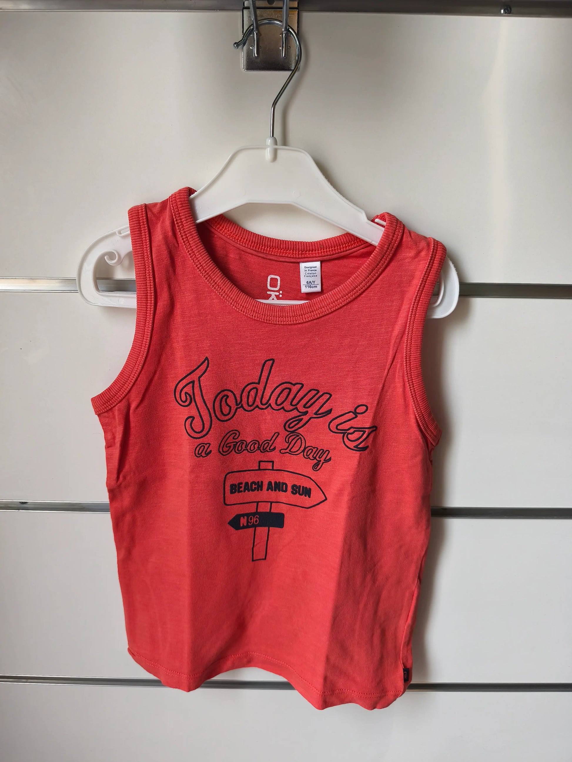 Plein de peps et de bonne humeur, ce débardeur orange-rouge illumine instantanément le dressing des enfants. Son message positif « Today Is a Good Day » invite à profiter pleinement de chaque journée, avec style et légèreté.