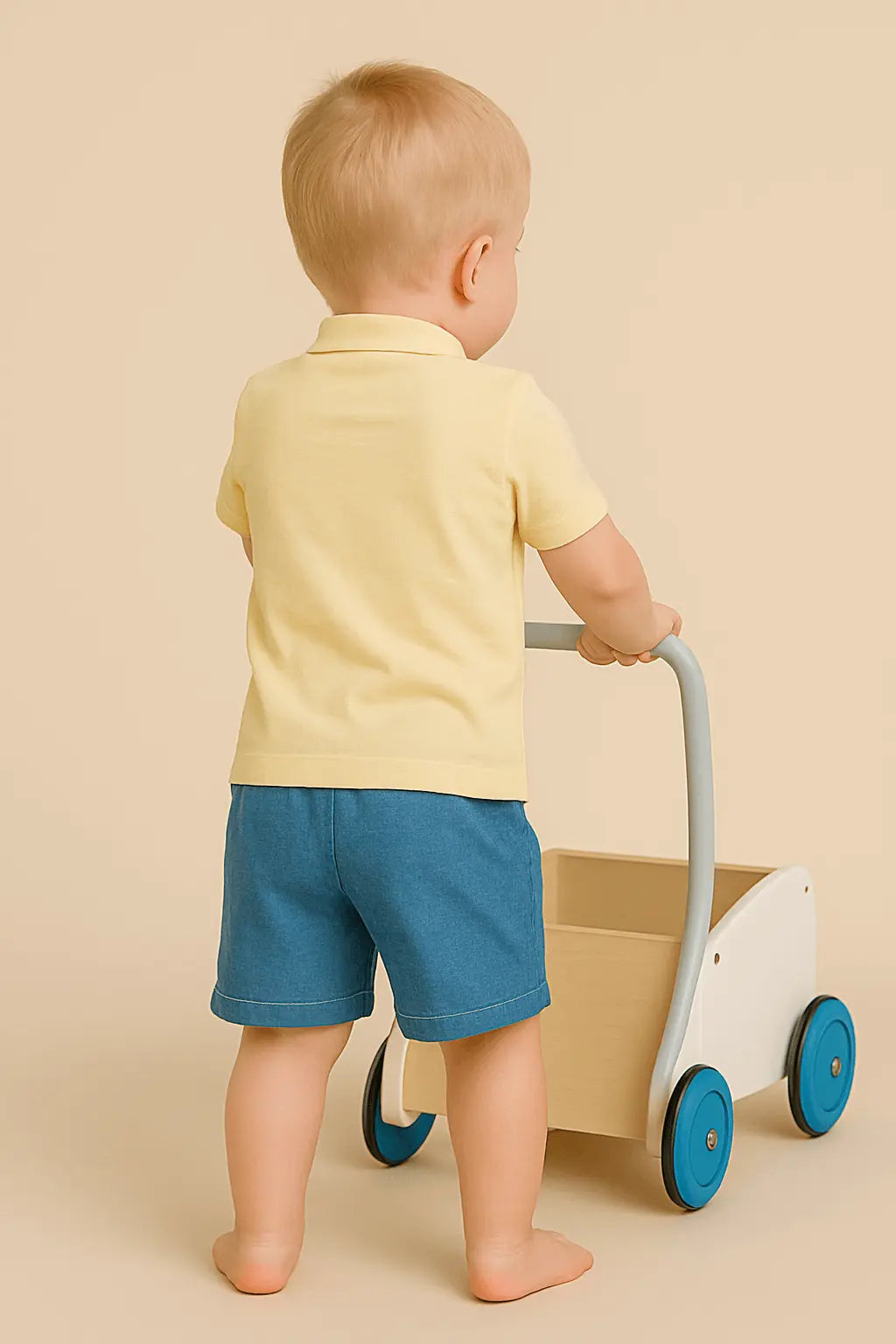 Un short bleu type jean, coupe courte avec poches à l’avant, qui s’accorde parfaitement avec le polo tout en laissant bébé libre de ses mouvements.