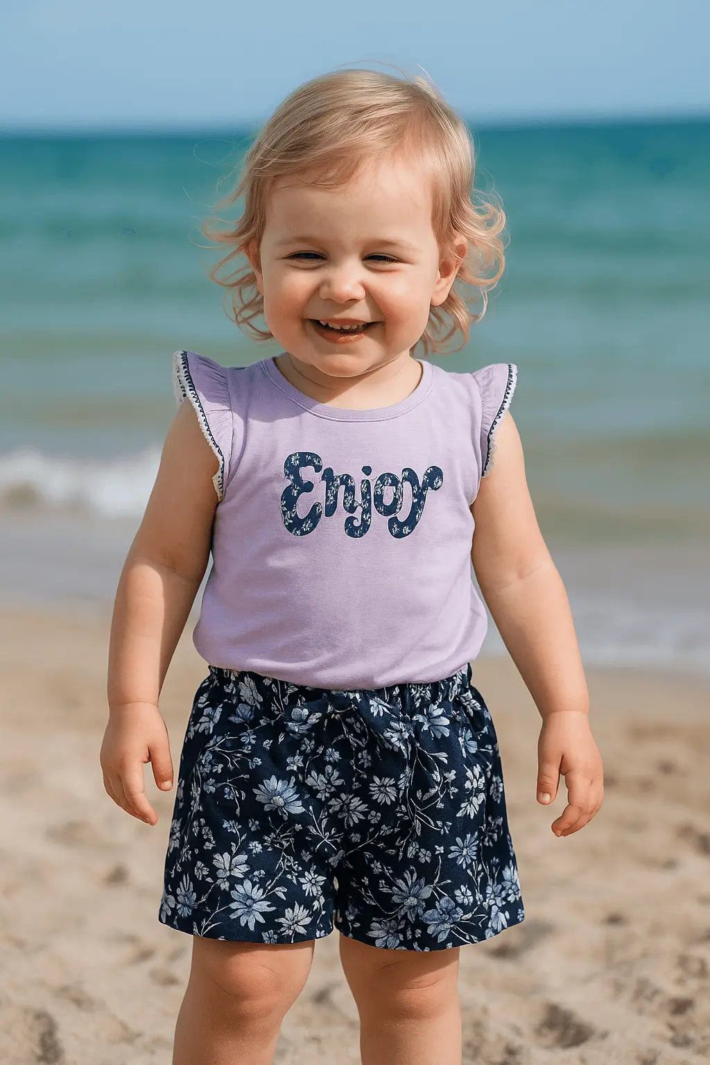 👕 Haut : T-shirt mauve à manches courtes, orné de l'inscription "Enjoy" en bleu foncé et de délicates fleurs blanches. Finitions en dentelle autour des manches pour une touche élégante.