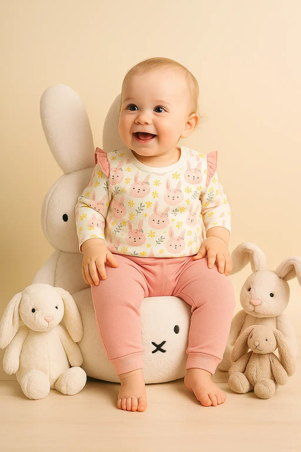 Un brin de nature, une touche de corail, et beaucoup de tendresse : cet ensemble est un vrai coup de cœur ! 🧡🐇