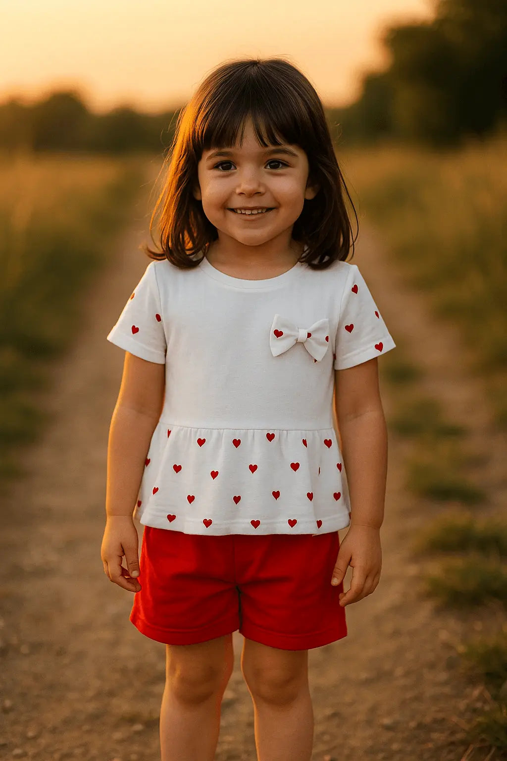 Offrez à votre petite fille un look craquant et confortable avec cet adorable ensemble estival fille 100% coton, parfait pour les journées ensoleillées ! Ce t-shirt blanc à manches courtes est décoré de petits cœurs rouges sur les manches et le bas du t-shirt, avec un joli nœud cousu au centre pour une touche de tendresse.