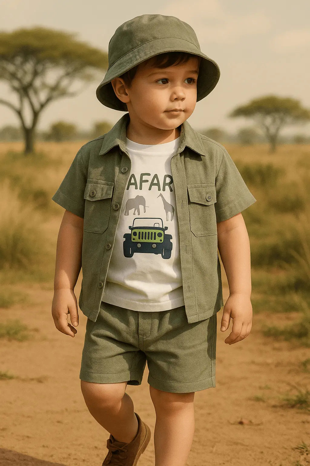 Offrez à votre petit aventurier un look estival stylé avec cet ensemble garçon 3 pièces kaki au design safari ! Parfait pour les journées ensoleillées, cet ensemble se compose de :