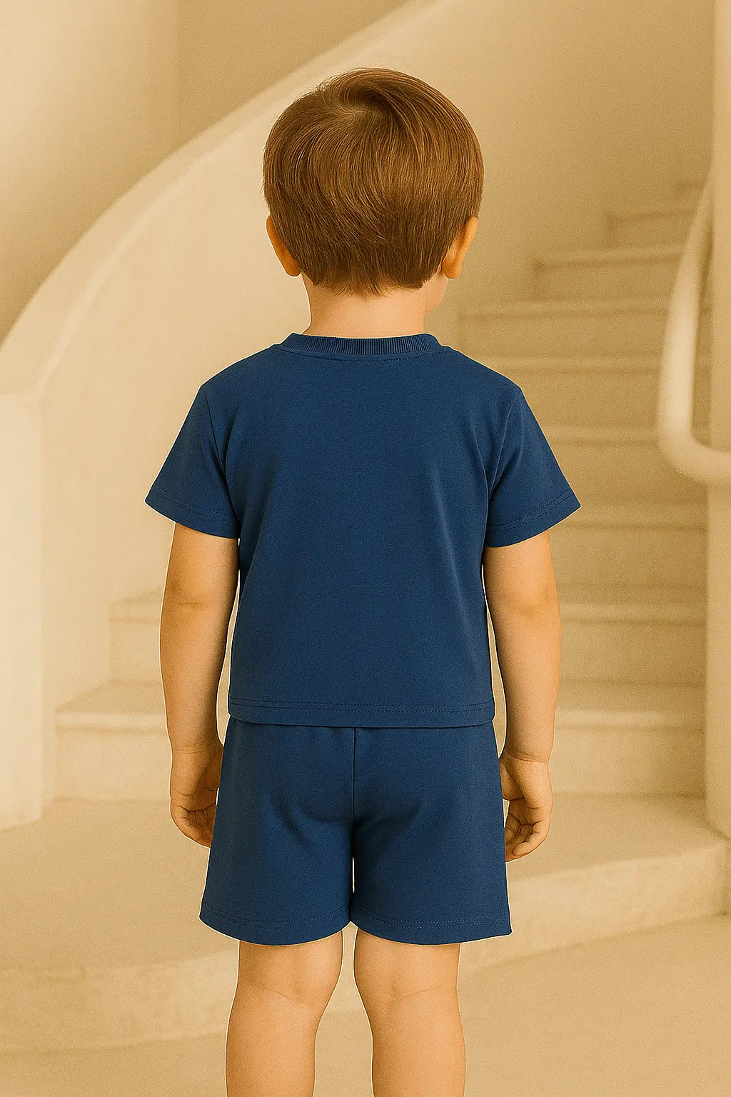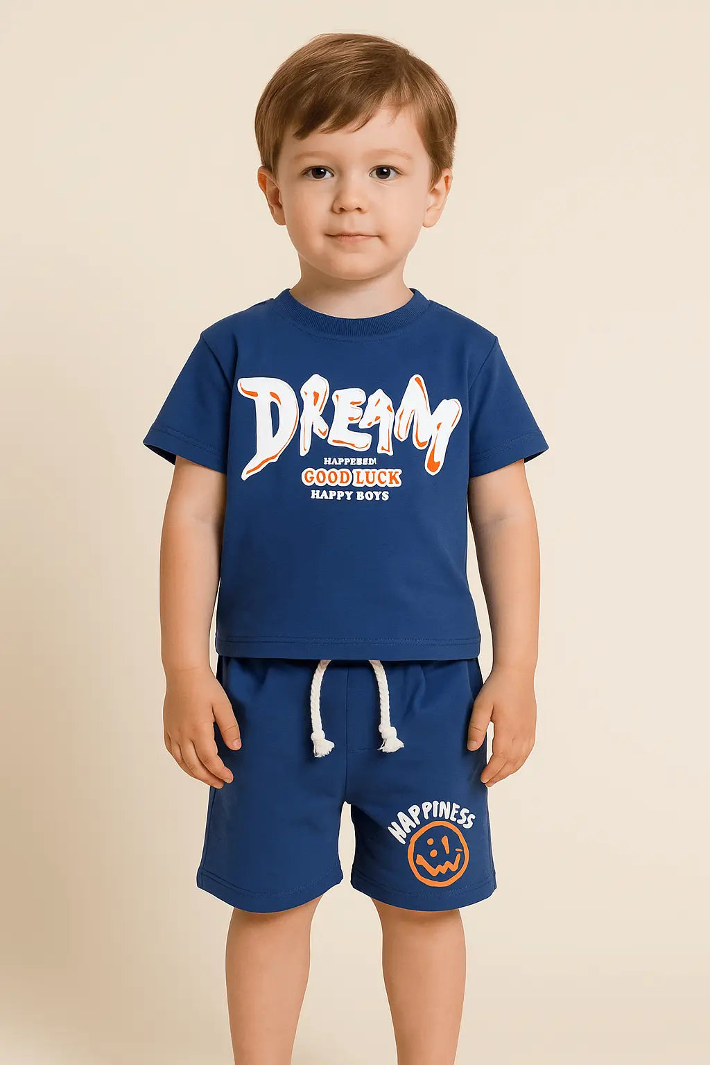 Offrez à votre petit garçon un look tendance et confortable avec cet ensemble estival 100% coton. Composé d’un t-shirt bleu marine à manches courtes avec l'inscription "Dream" et d’un short assorti bleu marine orné du mot "Happiness", cet ensemble est parfait pour les journées ensoleillées.