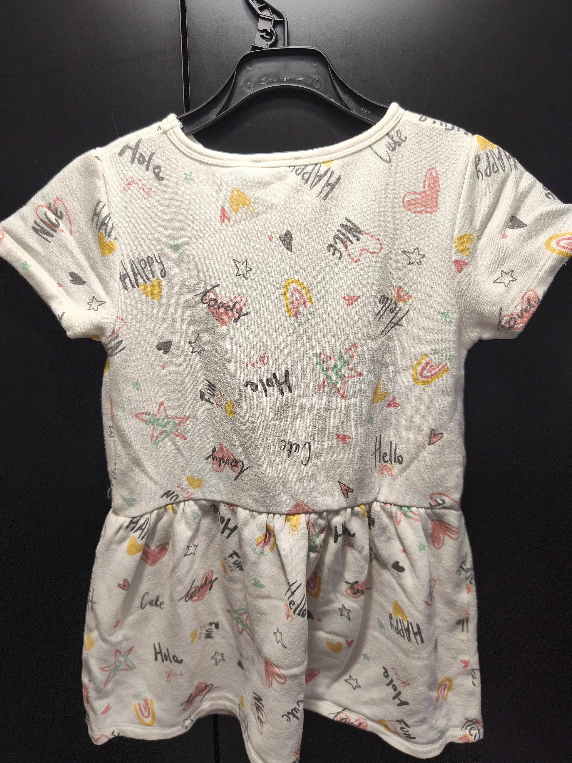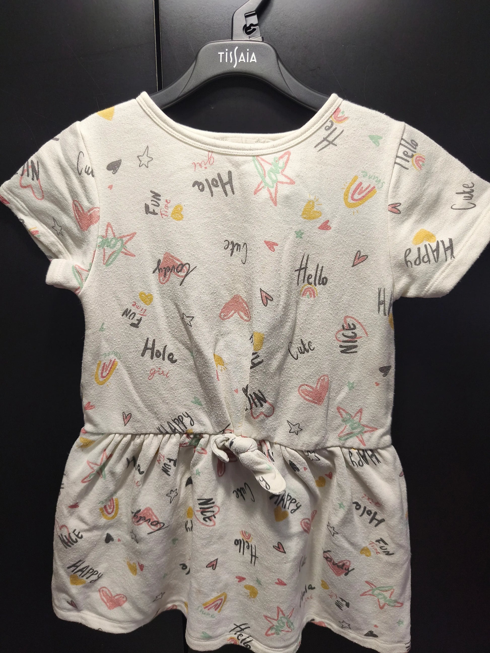 Robe Orchestra Blanche – Manches Courtes, Dessin Cœur et Arc-en-Ciel, Motifs Étoiles et Mots, Nœud Décoratif – 3 Ans