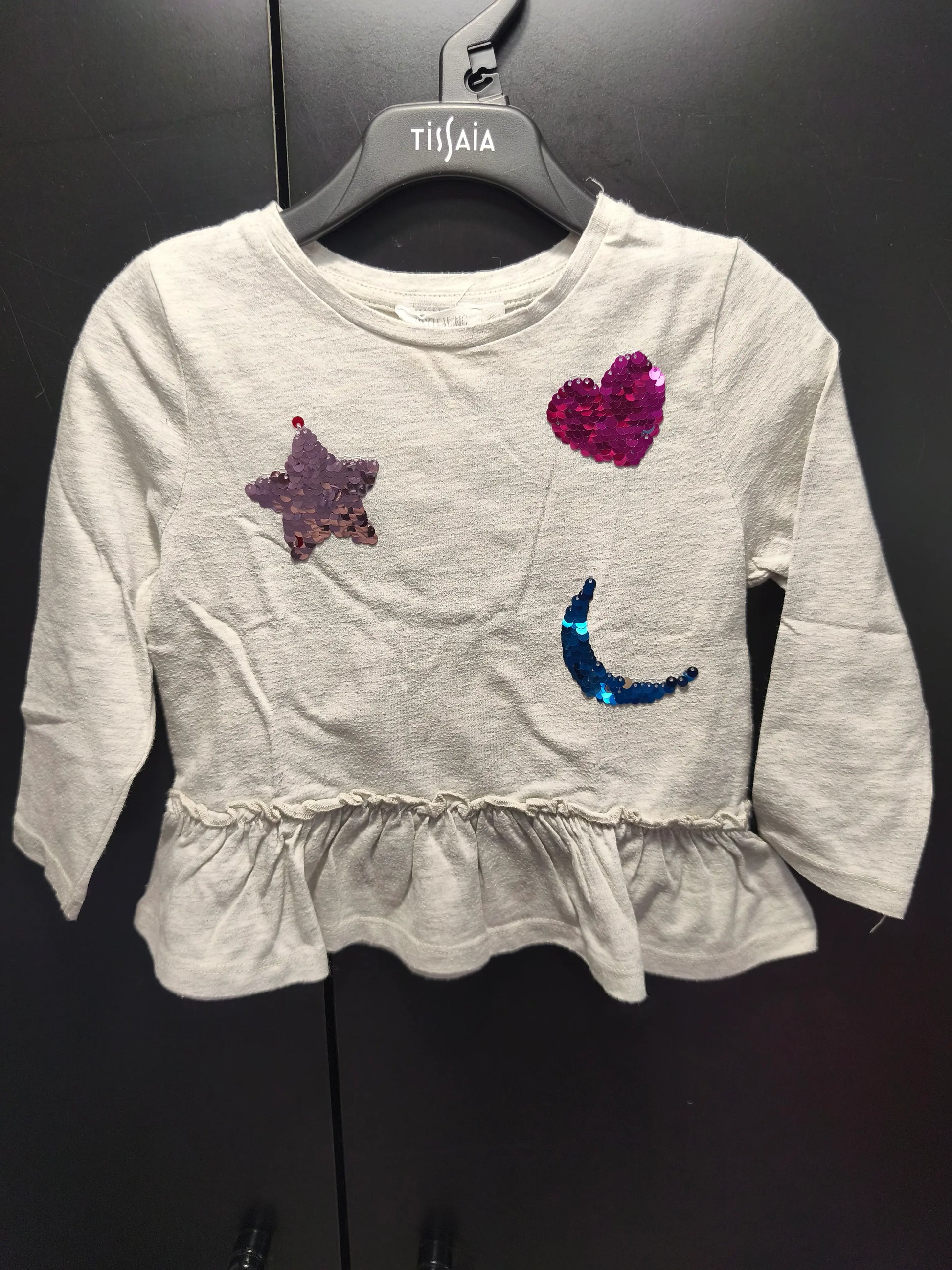 Robe Storytelling Grise – Manches Longues, Volants à la Jupe et Sequins Étoile, Cœur et Lune – 2 Ans
