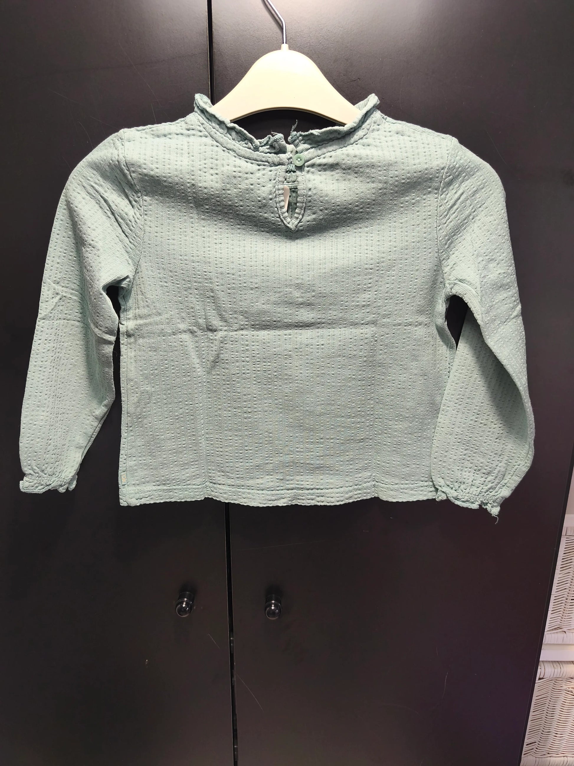 Apportez confort et légèreté à votre petite fille avec ce t-shirt Okaïdi vert d’eau en gaze de coton 🌿. Ses manches longues resserrées aux poignets offrent un maintien parfait tout en laissant bébé libre de bouger.