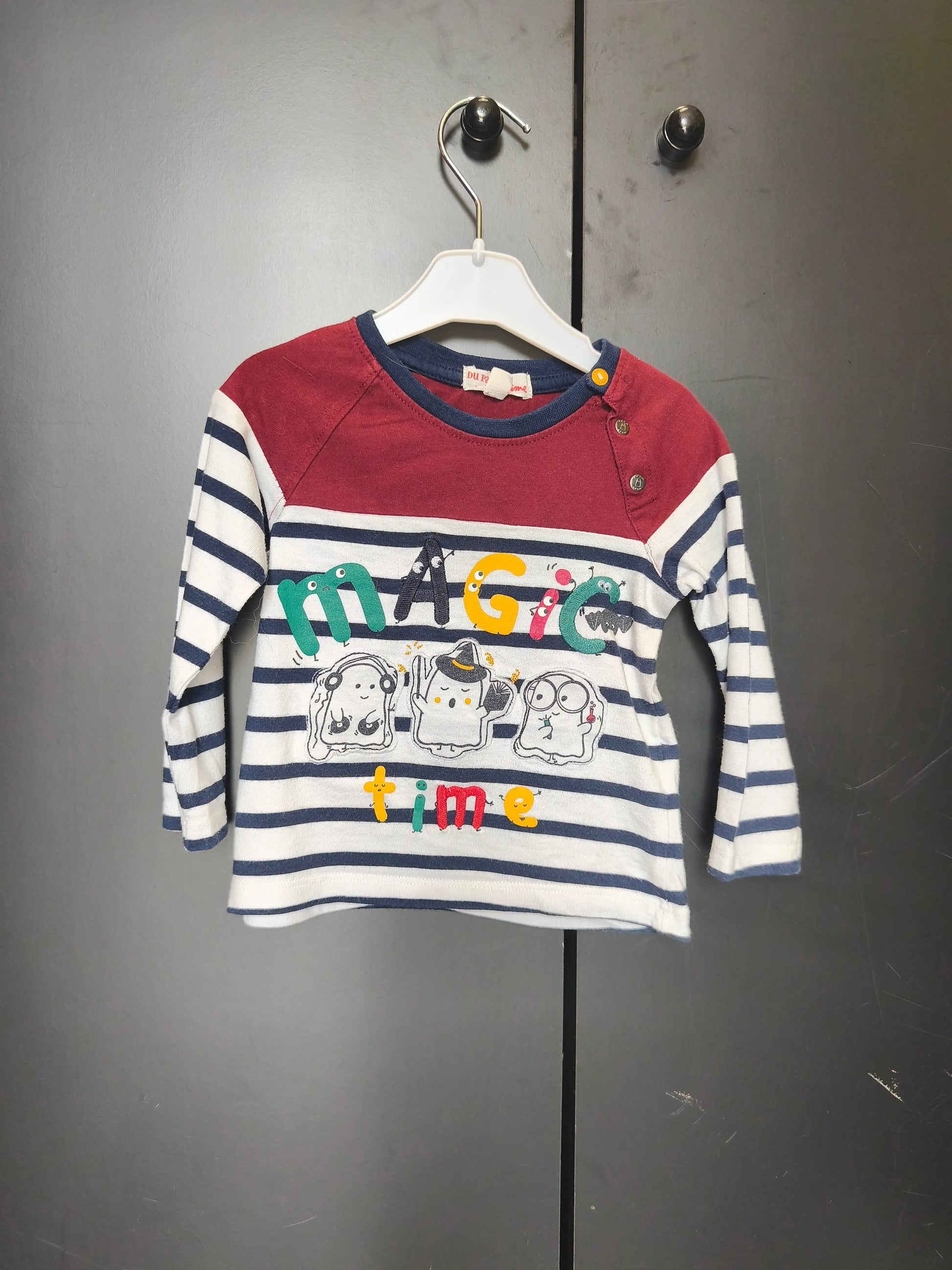 Offrez à votre bébé ce t-shirt Du Pareil au Même 12 mois au charme marin avec ses rayures bleu nuit sur fond blanc. Son col rond rouge bordeaux ajoute une note colorée et élégante, tandis que l’inscription “Magic Time” apporte une touche féerique et ludique. Pratique à enfiler grâce au bouton à l’épaule, ce t-shirt manches longues est idéal pour garder bébé au chaud tout en lui assurant confort et style.