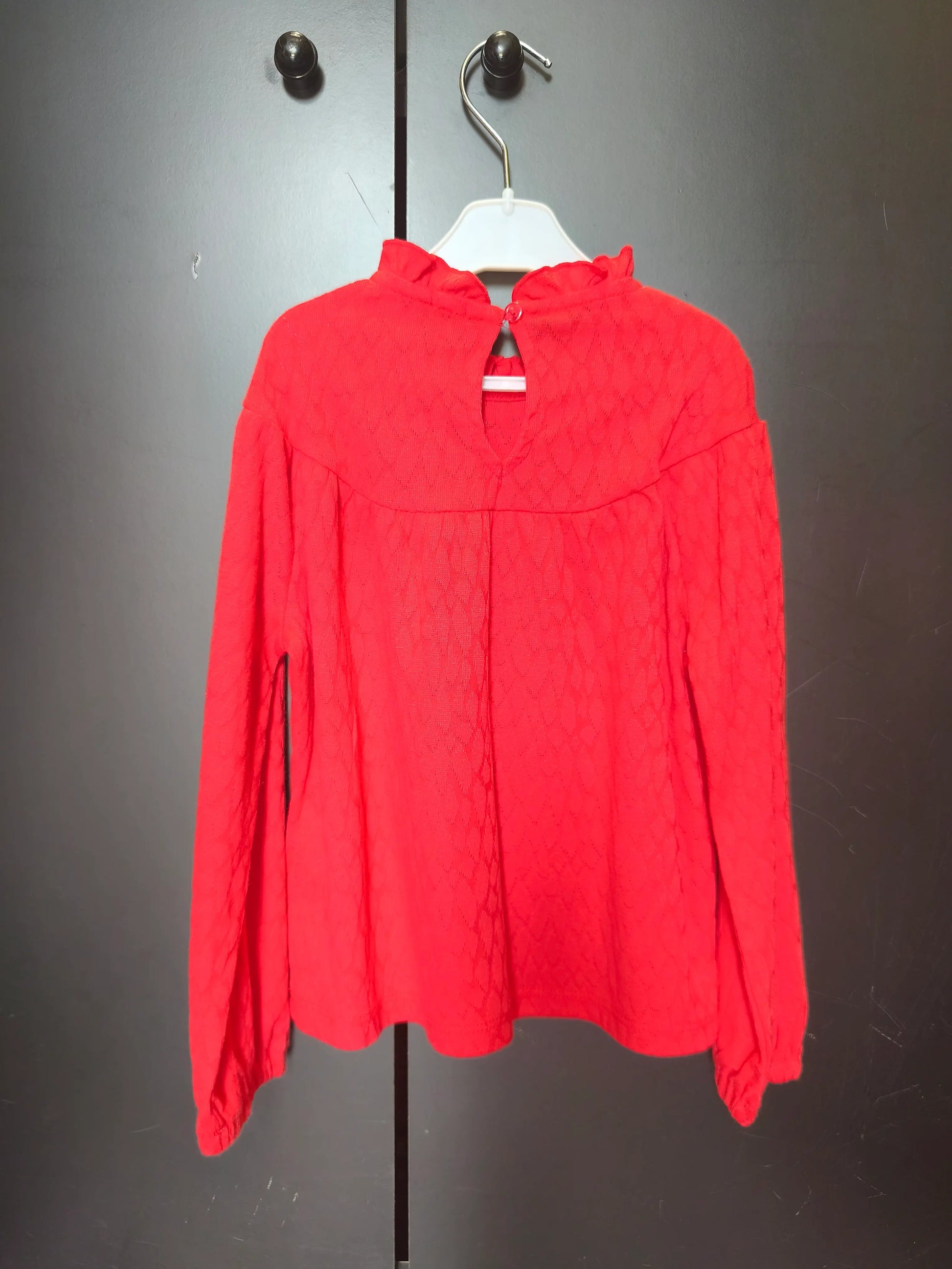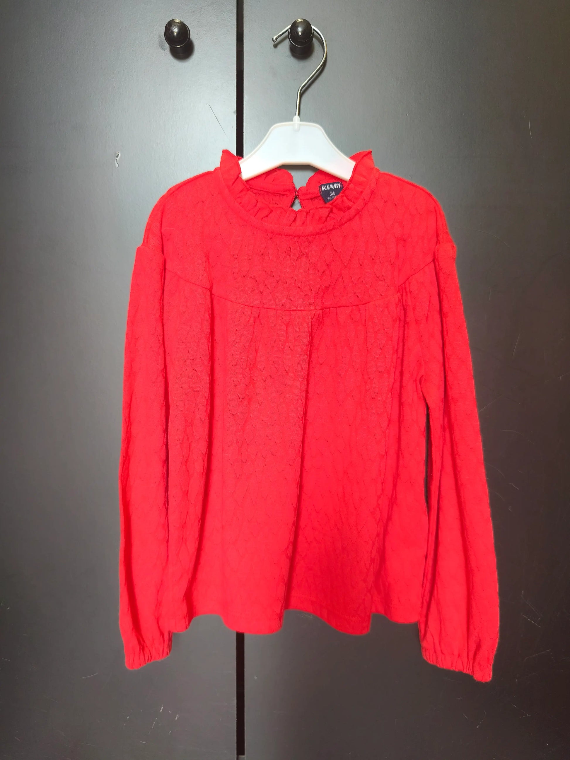 T-shirt rouge vif Kiabi 5 ans – manches longues et col volanté élégant ❤️✨