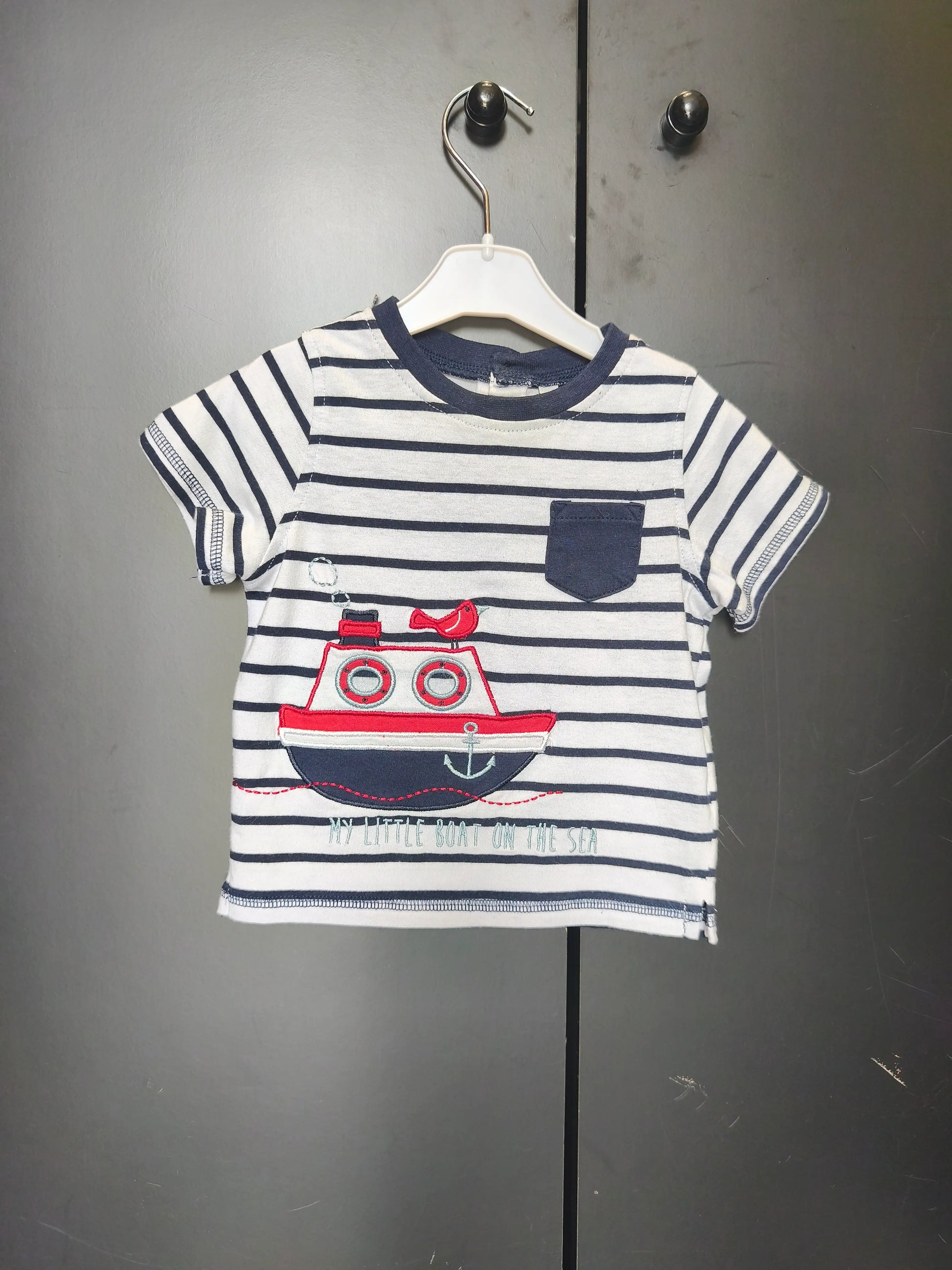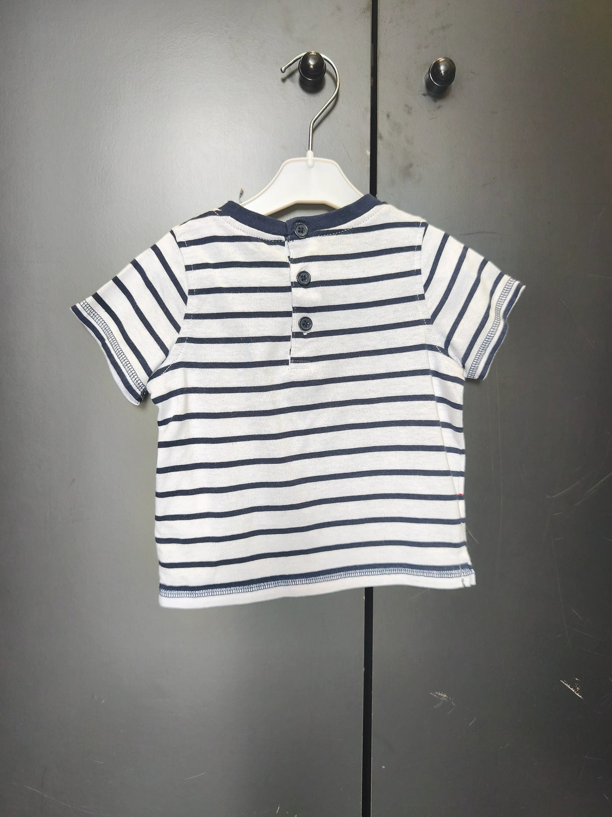 T-shirt marinière 12 mois - Blanc & bleu avec broderie bateau ref 10